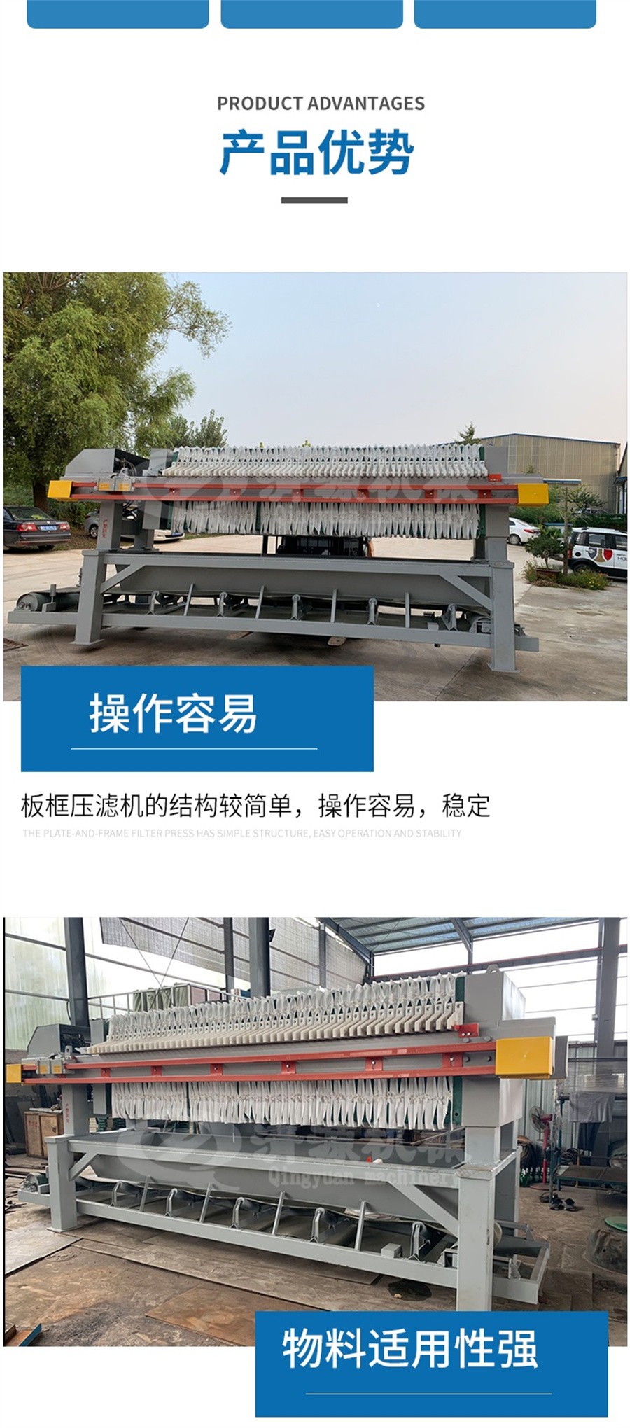 三、優(yōu)點(diǎn):板框式壓濾機(jī)的優(yōu)點(diǎn)是:結(jié)構(gòu)較簡(jiǎn)單,操作容易,運(yùn)行穩(wěn)定,保養(yǎng)方便;過濾面積選擇范圍靈活,占地少;對(duì)物料適應(yīng)性強(qiáng),適用于各種中小型污泥脫水處理的場(chǎng)合。